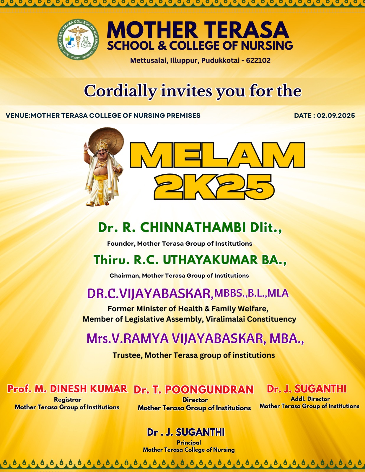 Mother Terasa School & College of Nursing proudly presents MELAM 2K25, a vibrant cultural celebration filled with joy and togetherness. Join us on 02.09.2025 at the College premises to witness an unforgettable day of tradition, talent, and festive spirit.